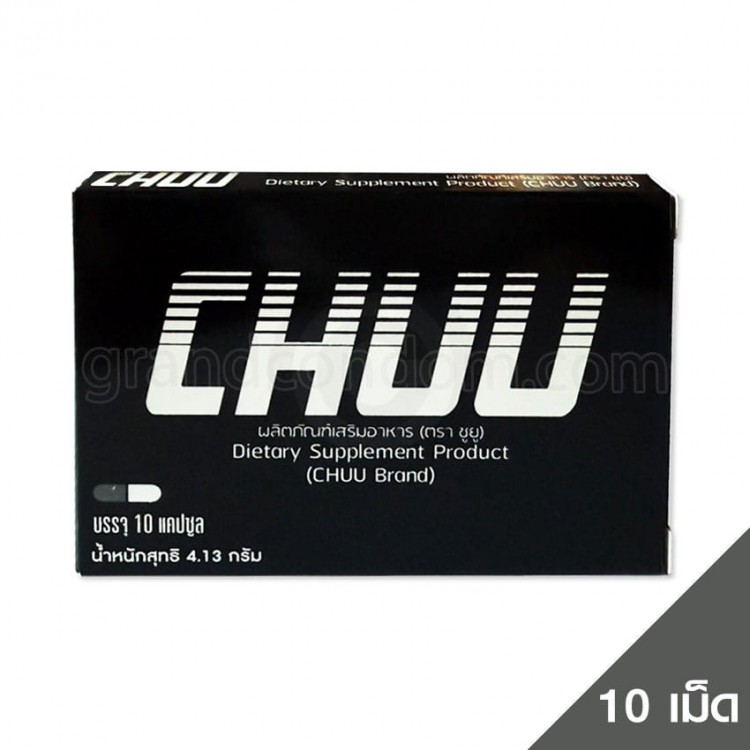 CHUU อาหารเสริมผู้ชาย ตรา ชูยู ผลิตจากส่วนผสมจากธรรมชาติ 100% ปลอดภัย ได้รับมาตรฐาน อย. บรรจุแคปซูล รับประทานง่าย อายุการเก็บรักษา 24 เดือน ผลิตในประเทศไทย รับประกันคุณภาพ เป็นยาบำรุงร่างกาย ช่วยเสริมพลัง เสริมความมั่นใจให้ผู้ชายเฉพาะกิจก่อนกิจกรรมทางเพศ สำหรับคุณผู้ชายการันตีผลลัพธ์สัมผัสได้ 1 กล่อง บรรจุ 10 แคปซูล ในเม็ดแคปซูลสีขาว กล่องสีดำ อันเป็นเอกลักษณ์ CHUU อาหารเสริมผู้ชาย ตรา ชูยู ได้ผลด่วนทันใจ ปลอดภัย เห็นผล